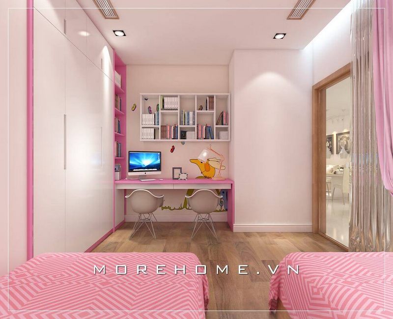 Hệ thống tủ gỗ công nghiệp được thiết kế với âm tường đẹp, tạo ra một khu vực lưu trữ đồ lớn, phù hợp với diện tích phòng ngủ và cung cấp nhiều tiện nghi hơn cho phòng của bé gái.