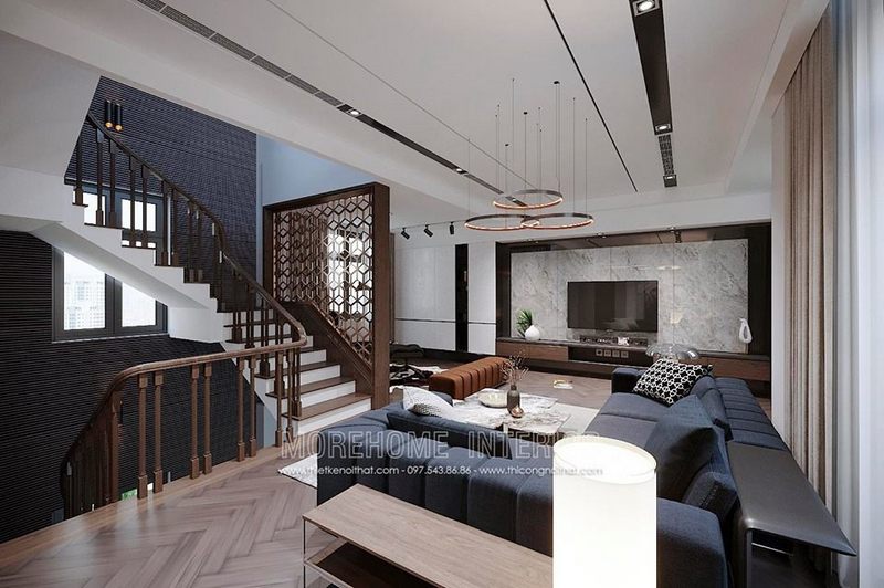 Cầu thang gỗ óc chó được thiết kế vuông song đôi với nhau, tạo nên một cảnh quan đẹp mắt và sang trọng bằng cách sử dụng gỗ tự nhiên.