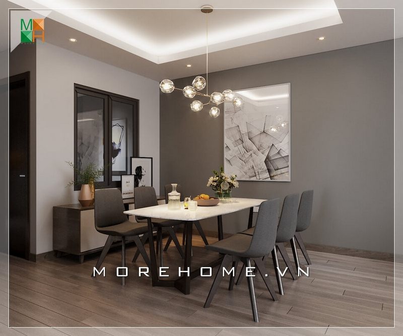 Thiết kế nội thất phòng ăn chung cư hiện đại, đơn giản với tone màu ghi sáng trẻ trung và ấn tượng