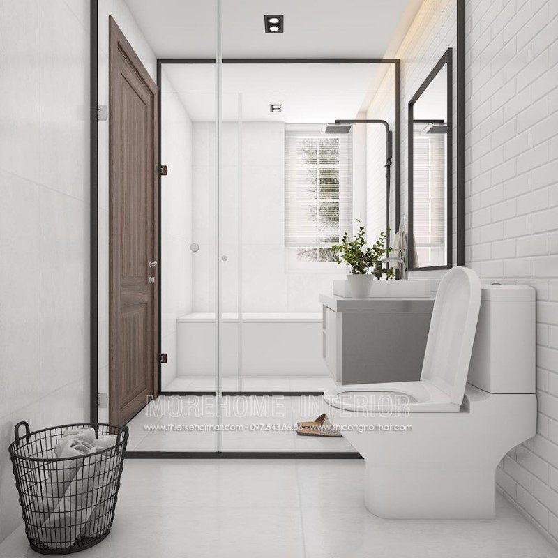 Phòng tắm nhỏ được trang trí bằng màu sáng và có sử dụng ánh sáng từ bên ngoài, giúp tạo cảm giác rộng rãi và thoải mái.
